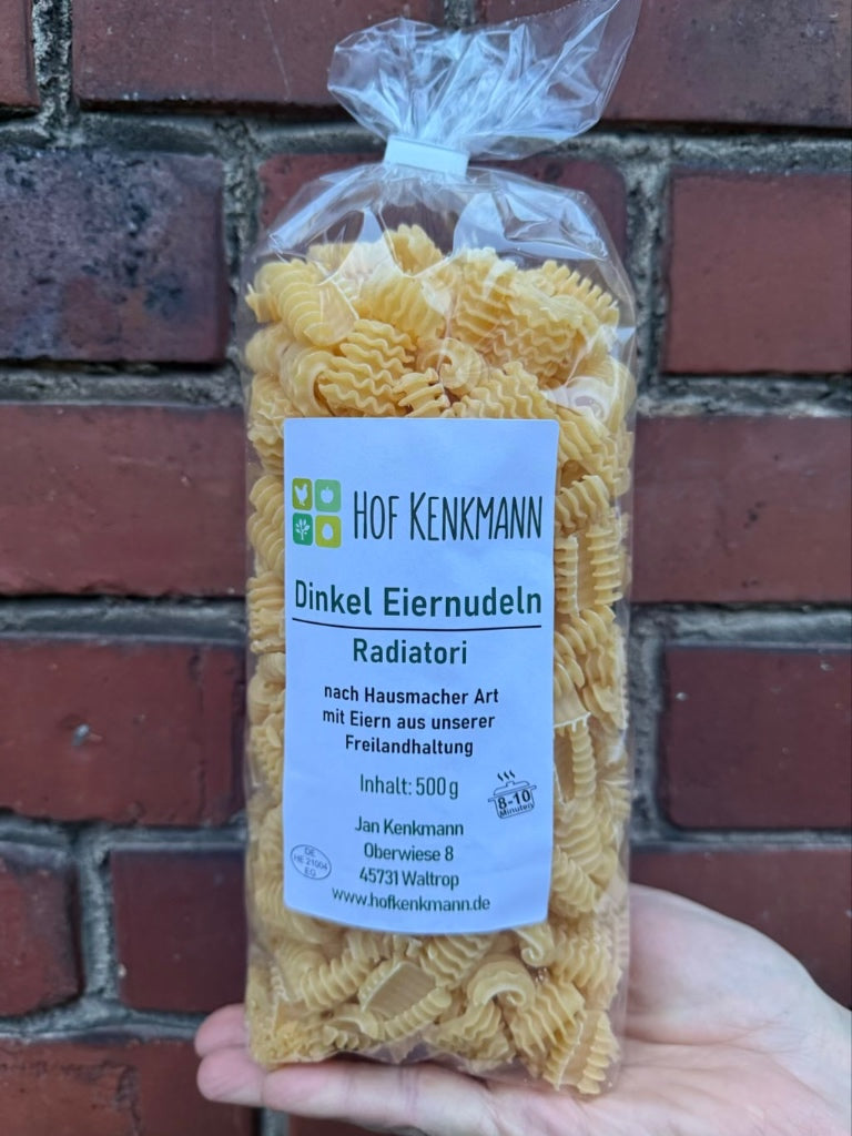 Eiernudeln aus hellem, frisch gemahlenen Dinkelmehl. Hergestellt nur mit unseren Freilandeiern aus besonders tiergerechter Mobilstall-Hühnerhaltung.